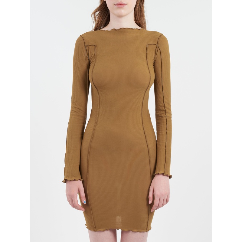 Long sleeve dress with wide boat neckline. Thin and soft. Formfitting. Babylock finish on all edges.BoatneckOrganic cotton ribExposed contrast seamsLettuce edge at neckline and hemsMaterialsFabric Content: 91% organic cotton, 9% elastaneMade in PortugalSiz