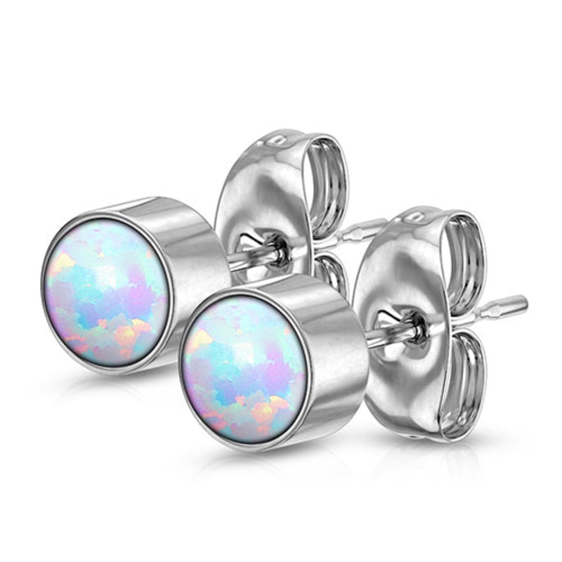 These 20 gauge bezel-set opal earrings are made from 316L stainless steel. These are only available with a 3mm synthetic white opal.