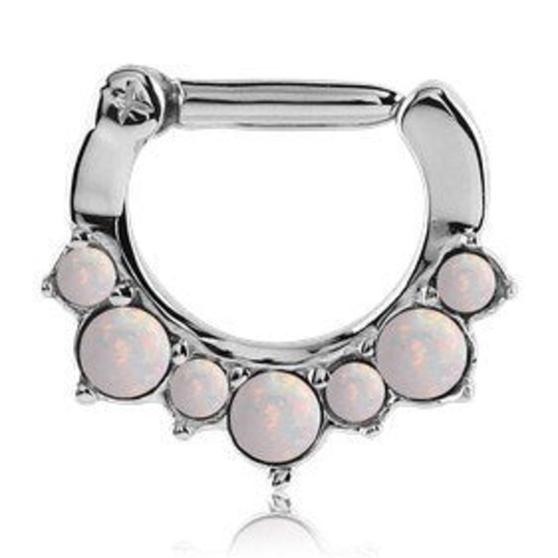 The 16 gauge opal crown septum clicker is made from 316L stainless steel. The 5/16" long barbell is hinged on one side and snaps firmly shut on the other. The interior diameter is measured inside the clicker from top to bottom. Available with a white synth