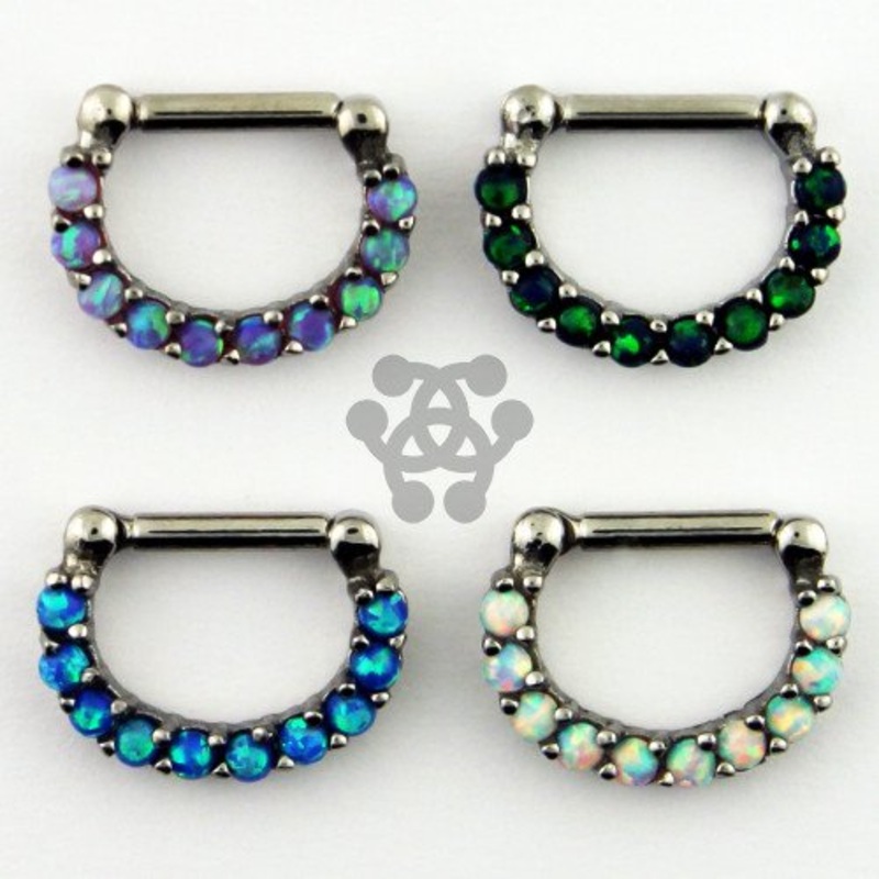 The opal paved septum clicker is made from 316L stainless steel. The 5/16" long barbell is hinged on one side and snaps firmly shut on the other. Interior diameter is a measurement inside the clicker from top to bottom. Choose your size and synthetic opal