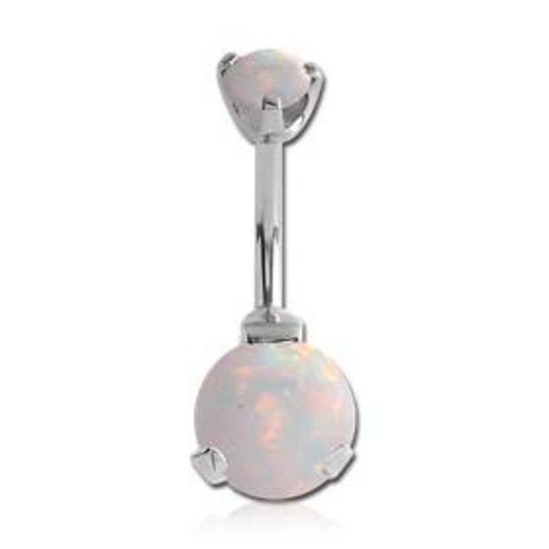 The 14 gauge opal prong belly ring is made from 316L stainless steel with internal threading. Only the top end is removable. Choose your synthetic opal color below.