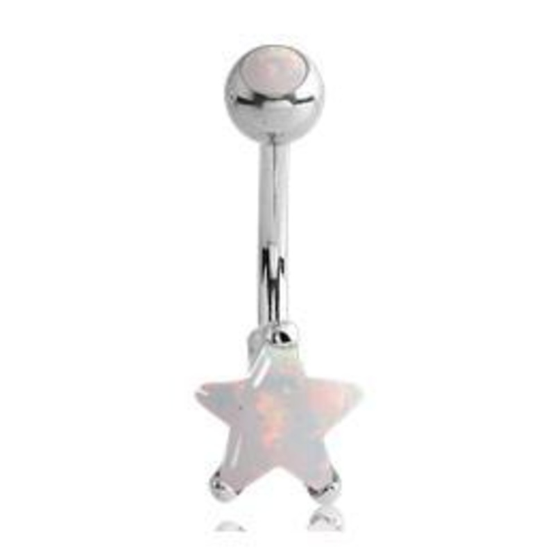 The 14 gauge opal star belly ring is made entirely from 316L stainless steel with external threading. Choose your 8mm synthetic opal star color below.