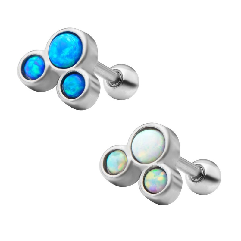 The 18 gauge 1/4" opal triocartilagebarbell is made from externally threaded 316L stainless steel. Only the ball end is removable. These are only available with pink synthetic opals.