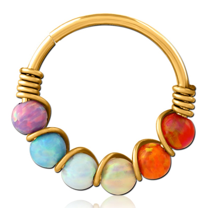 The 20 gauge opal wire wrapped continuous ring is made from gold PVD coated 316L stainless steel. If you’re unsure how to open and close continuous rings (a.k.a. seamless), be sure to check out our video demonstration.