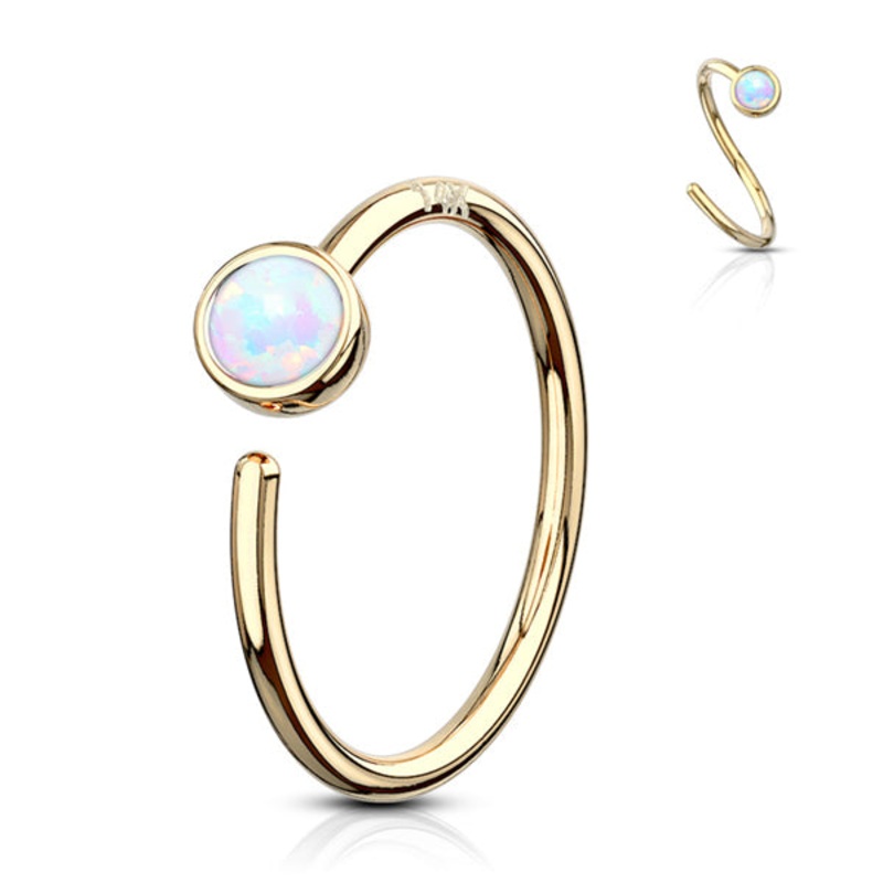 The 20 gauge opal nose hoop is made from solid 14k yellow gold. If you’re unsure how to open and close continuous rings (a.k.a. seamless), be sure to check out our video demonstration.