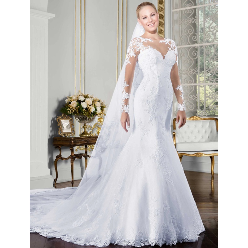 Open Back Sexy Formal Wedding Dresses Mermaid / Trumpet Illusion Neck Long Sleeve Chapel Train Lace Bridal Gowns With Lace Appliques