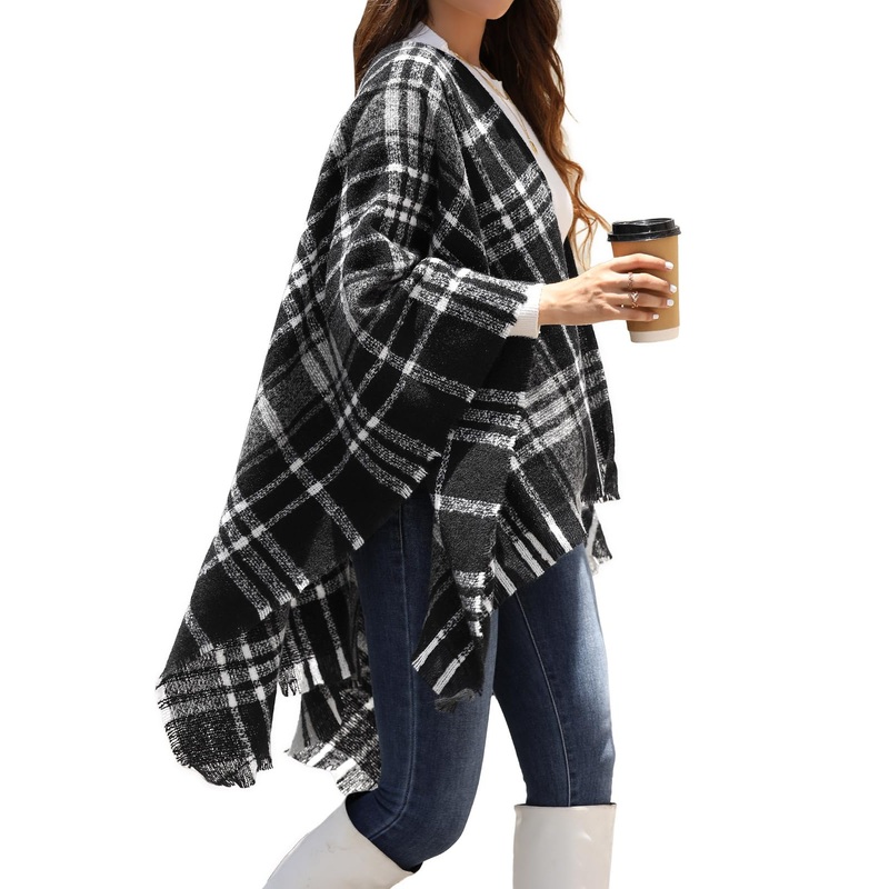 The timeless **plaid design** blends four trendy color combinations, each with its own unique flair, while the open-front style and chic tassels add a playful touch. The V-shaped cut drapes beautifully over your shoulders, flattering every body shape, and making it easy to slip on for a day out or a cozy evening in.