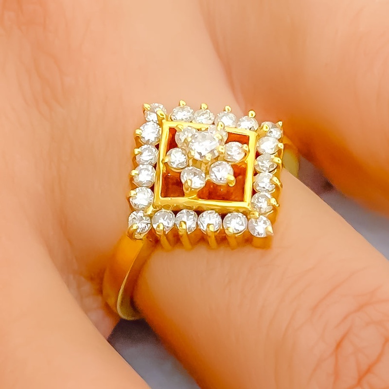 This 18k yellow gold ring, weighing 4.5 grams, features a unique open square design adorned with 0.75 carats of round brilliant diamonds in F-G color and VS quality. The open square shape adds a modern and architectural flair, creating a striking balance o