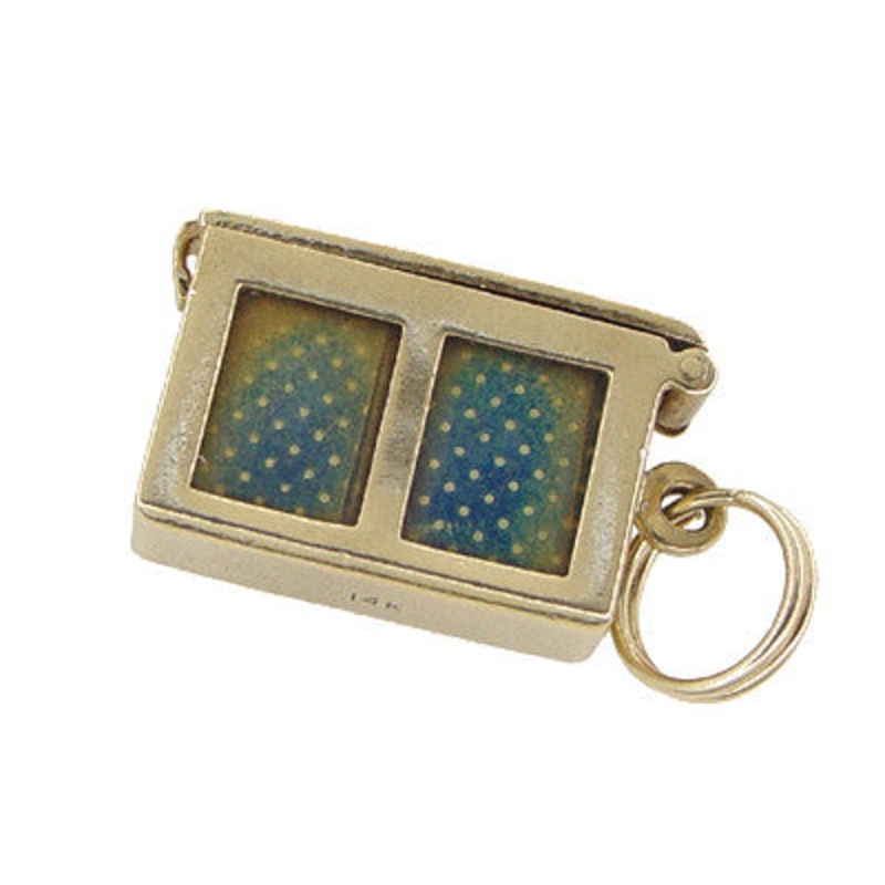 This circa 1950's vintage collectible 14K yellow gold deck of cards moveable vintage estate charm, is an uncomparable jewelry conversation piece. The deck of cards is visible through 2 clear sides of the charm, and the hinged lid of this unique vintage car