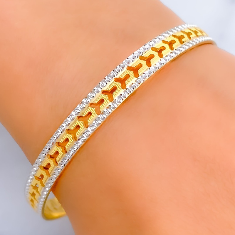 This bangle combines the allure of 22k gold with an opulent design, featuring an elegant interplay of yellow and white gold finishes. It has a light yet substantial feel with a weight of 15.6 grams, signifying high-quality craftsmanship. Tailored with a si