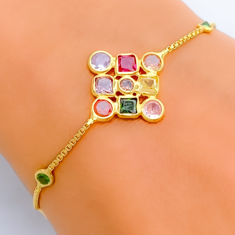 This 22k gold bracelet radiates opulent gleam, weighing 4.4 grams. The yellow gold finish beautifully enhances the brilliance of the cubic zirconia stones, creating a luxurious and elegant appeal. Measuring 6.5 inches in length, it offers a snug and secure fit with its durable S-lock clasp. Perfect for those who value refined craftsmanship and timeless sophistication, this bracelet is a striking addition to any jewelry collection.