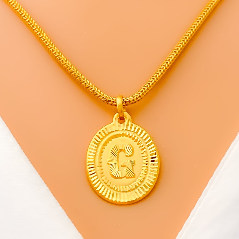 This 22k gold letter pendant, weighing 1.6 grams, combines a striking round design with polished yellow gold for an opulent finish. Measuring 1.1 inches in length, it showcases intricate craftsmanship that exudes timeless elegance. Perfect for pairing with
