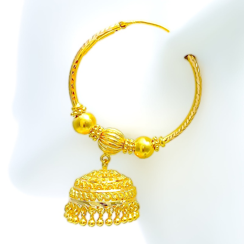 These luxurious 22k gold Bali earrings feature an opulent three orb chandelier design, weighing 20.2 grams. With a polished yellow gold finish, they have a diameter of 1.4 inches and hang gracefully at 2.25 inches. These earrings are a magnificent choice f