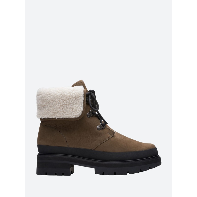 Clarks take on a classic hiking boot, the Orianna Turn in rugged leather for a classic look. The faux shearling linings brings a winter-ready twist, and the chunky lightweight sole keeps steps light and free.Ankle heightLace-up closureFaux fur collarRound