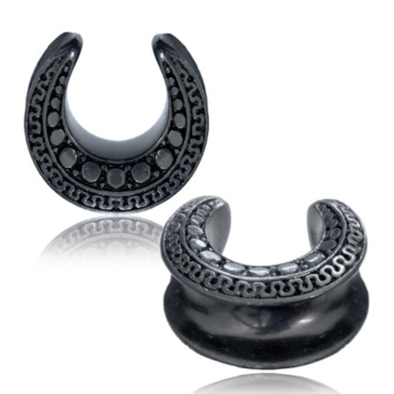 Theseornate saddle spreaders are made from gun metal. They have a wearable area of 5/16″ between flares. These should fit so long as your lobes can handle large flares, but many customers prefer these one smaller size than the plug size they normally wear. Choose your size below.