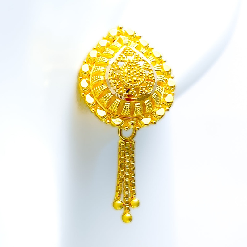 These exquisite 22k yellow gold earrings, weighing 5.7 grams, feature an intricate hanging chain design that exudes elegance and sophistication. Designed in a classic tops style, each earring measures 1.25 inches in length and is secured with a screw-back post, ensuring a comfortable and secure fit. The high-purity gold and ornate craftsmanship make these earrings a standout addition to any jewelry collection. Ideal for those who appreciate unique and refined designs, they are perfect for both special occasions and adding a touch of luxury to everyday wear.