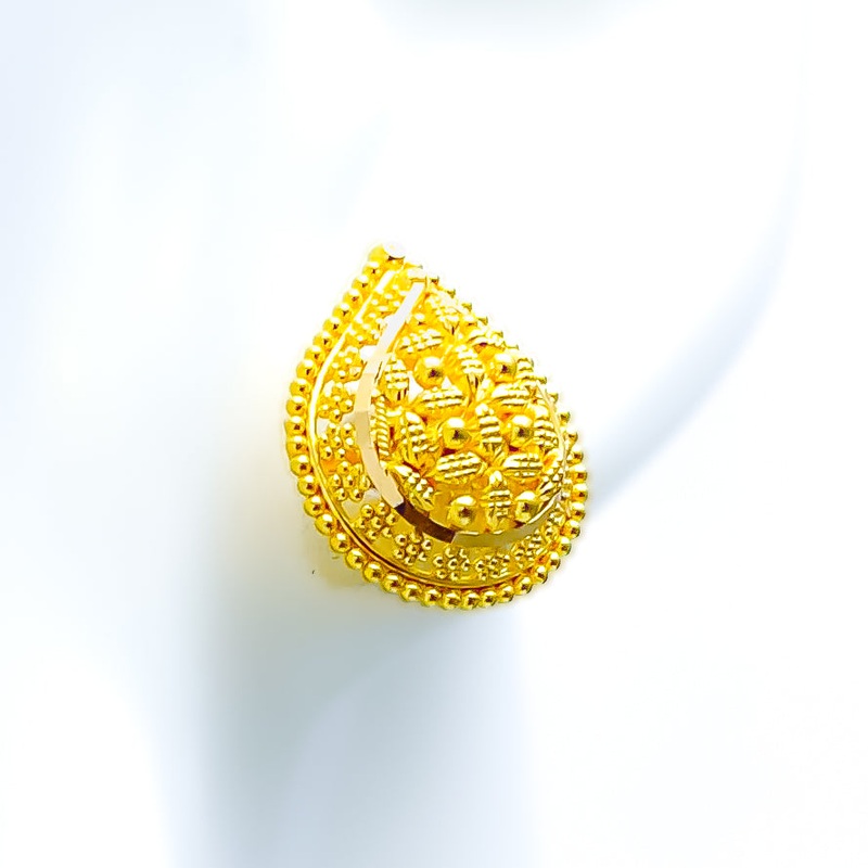 These exquisite 22k gold earrings, weighing 4.6 grams, feature a luxurious drop design that radiates elegance and refinement. The polished yellow gold finish enhances their intricate detailing, creating a sophisticated yet timeless appeal. Measuring 0.6 inches in diameter, these earrings offer a delicate yet eye-catching presence, secured with a sturdy screw-back post for a comfortable and secure fit. A seamless fusion of opulence and artistry, these earrings are a distinguished addition to any fine jewelry collection.