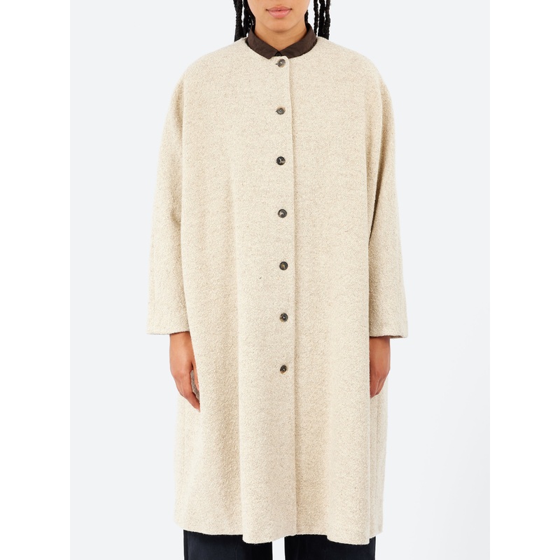 This minimalist coat from ApuntoB is tailored from a soft virgin wool and cotton blend in a timeless natural tone. Designed without a collar, it features a round neckline, relaxed dolman sleeves, and a front closure with horn-hued buttons for a subtle contrast. Side seam pockets offer everyday practicality, while the off-white cotton lining adds a clean finish inside. An effortlessly elegant layer with a modern, understated feel.