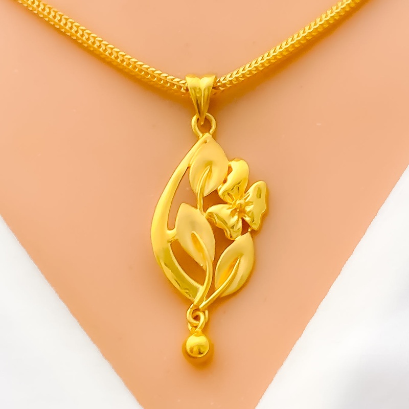 This exquisite pendant is crafted from 22k gold, weighing 2.8 grams, and showcases a stunning yellow gold finish. The design features a palatial blooming floral motif, extending 1.5 inches in length, embodying both elegance and intricate detailing. Perfect