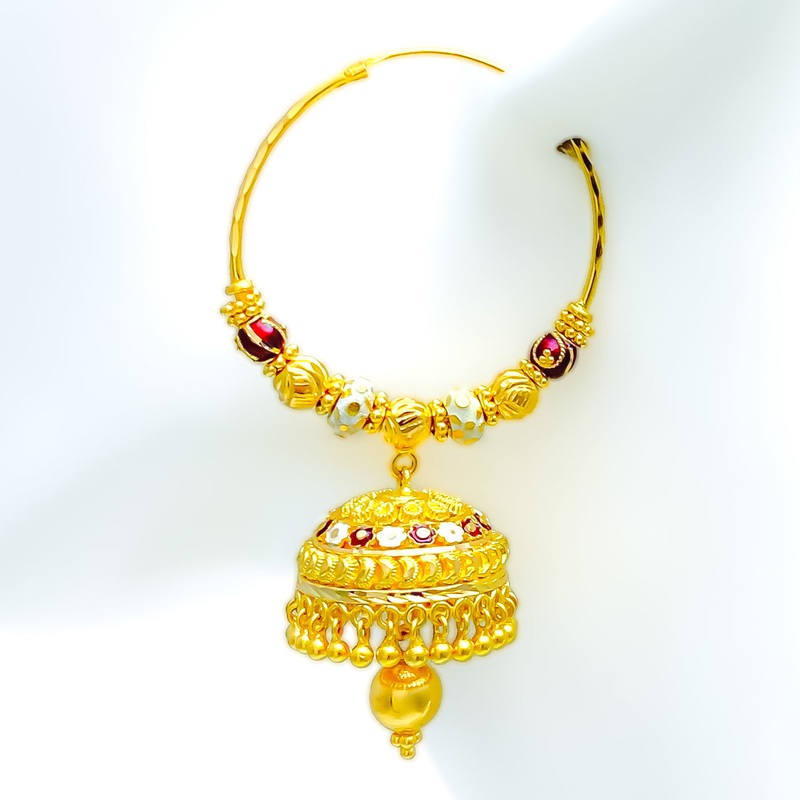 These 22k gold Bali earrings, weighing 19.6 grams, dazzle with a palatial bright chandelier Meena design. They boast a yellow gold finish, a diameter of 1.3 inches, and a length of 2.5 inches. Perfect for those who appreciate intricate designs and substant