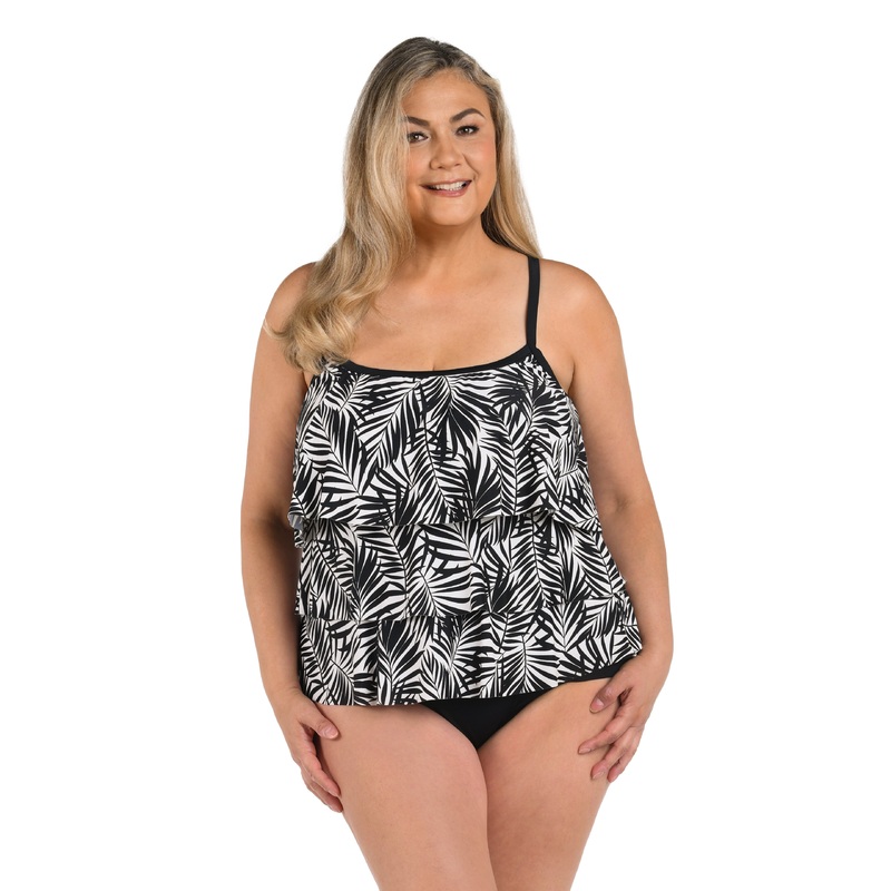 Free ship on orders $79 and up!This tankini top features a striking black-and-ivory design of overlapping palm leaves, creating a bold, high-contrast tropical motif. Ruffled layers create a loose, flowy fit that subtly disguises your stomach and waist, whi