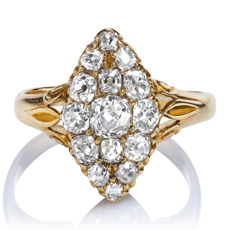 Antique Navette Shaped Old Mine Cut Diamond Cluster Ring