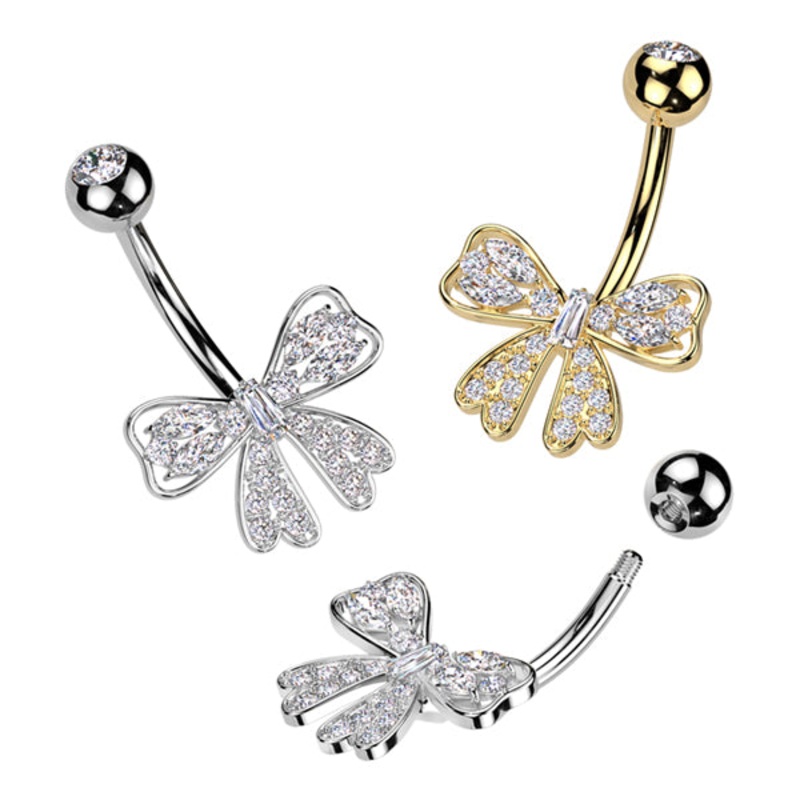The 14 gauge paved bow belly ringis made from 316L stainless steel with external threading. Only the 5mm ballend is removable. Choose your metal finish and gem color below.