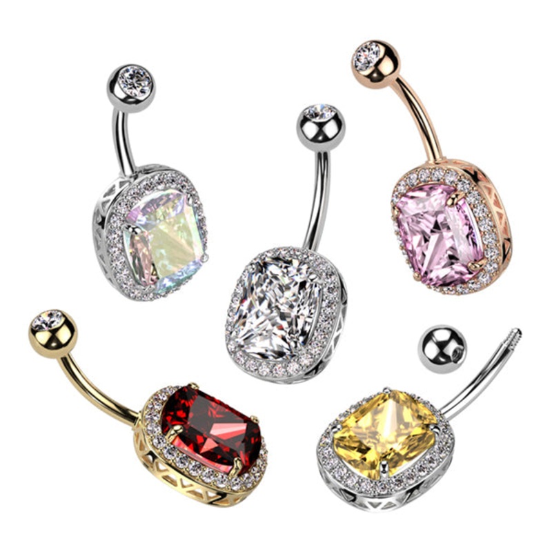 The 14 gauge paved oval belly ringis made from 316L stainless steel with external threading. Only the 5mm ballend is removable. Choose your metal finish and gem color below.