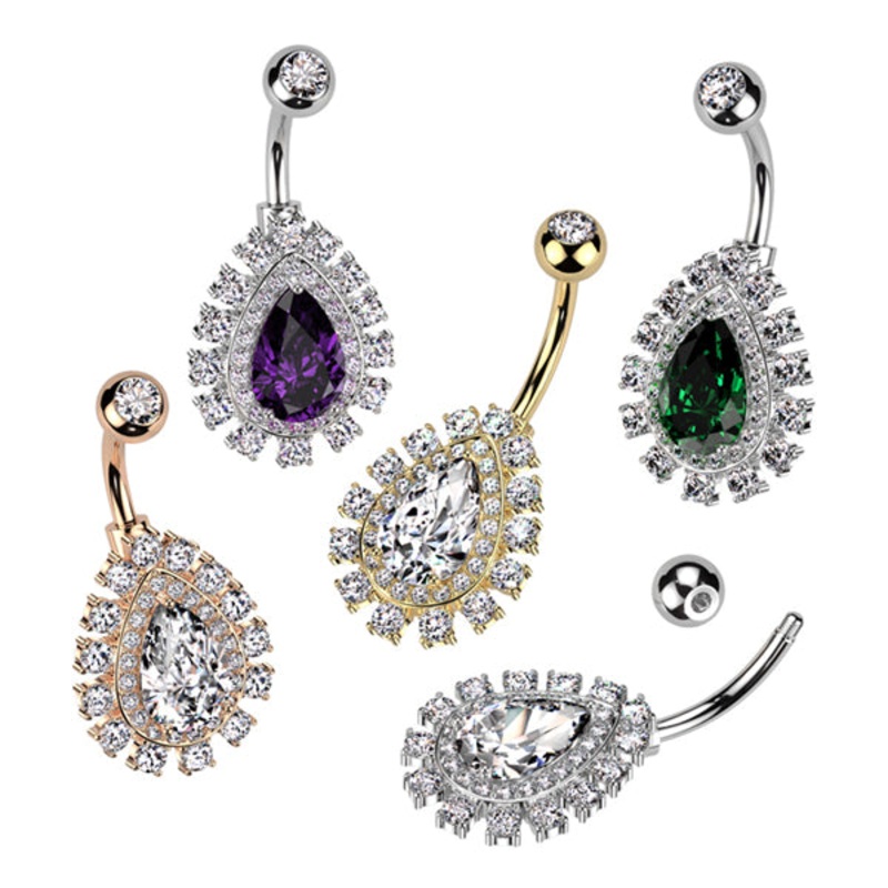 The 14 gauge paved teardrop belly ringis made from 316L stainless steel with external threading. Only the 5mm ballend is removable. Choose your metal finish and gem color below.