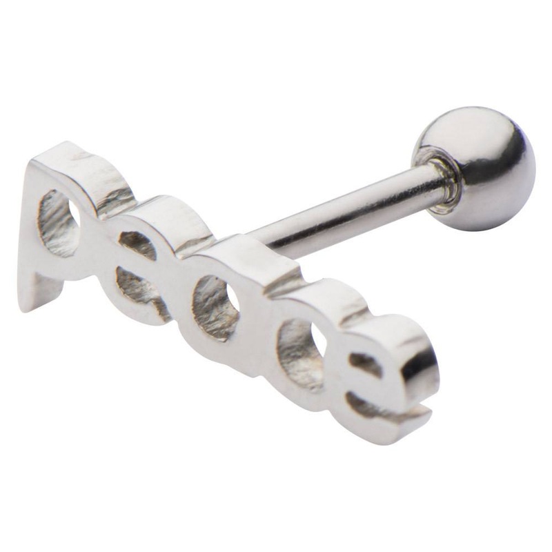 The 18 gauge 5/16″ peace cartilagebarbell is made from externally threaded 316L stainless steel.Only the ball end isremovable.
