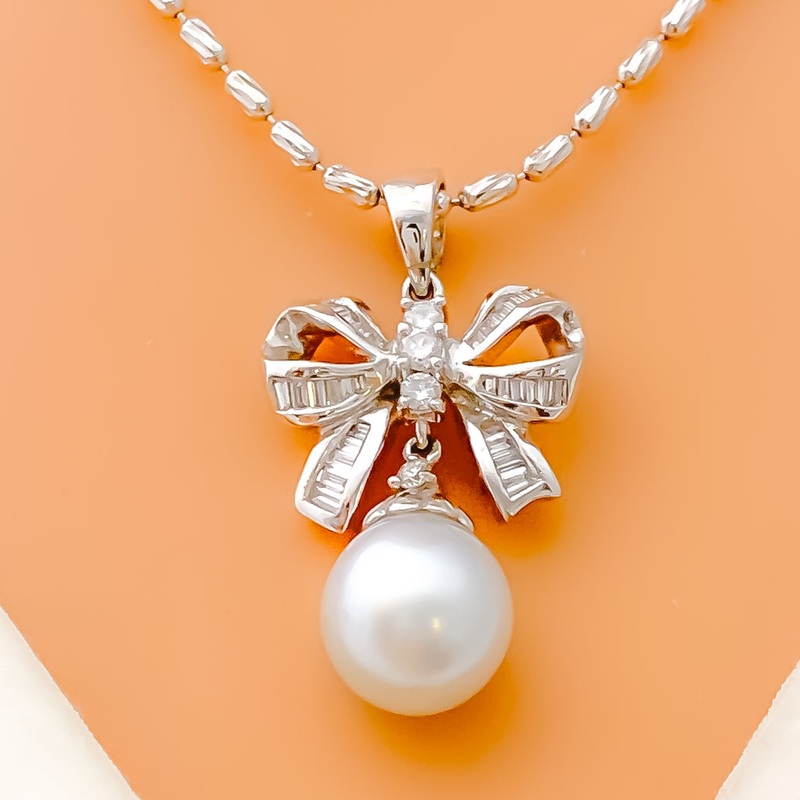 This 18k white gold pendant, weighing 4 grams, features a graceful ribbon design adorned with 0.51 carats of diamonds. The diamonds, with an F-G color and VS clarity, add exceptional brilliance and elegance. Complementing the design is a lustrous pearl, en