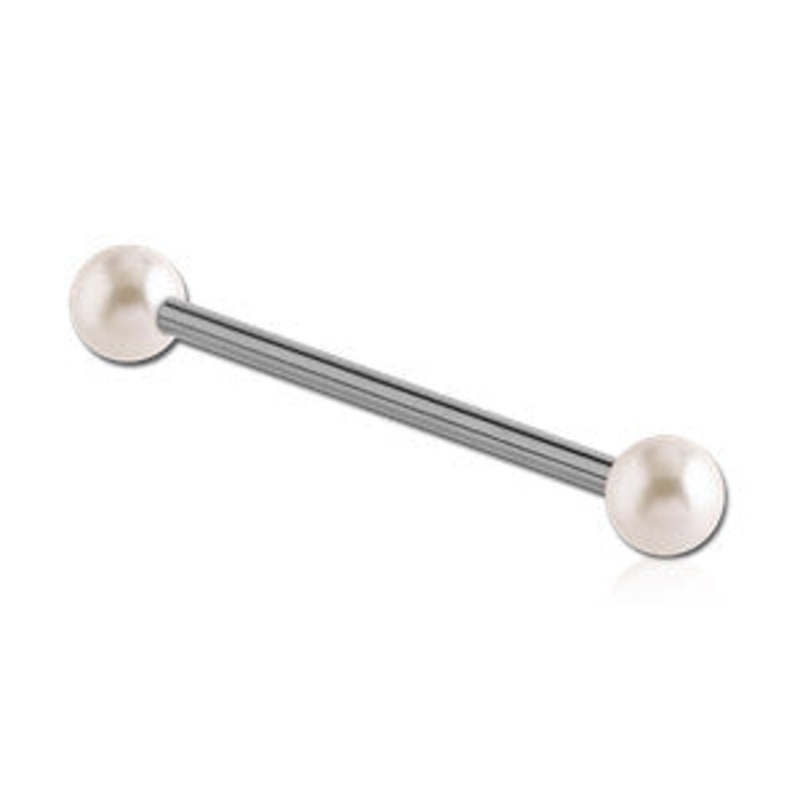 The 14 gauge straight pearl barbell is made from 316L stainless steel with external threading. Both synthetic pearl balls are removable. Choose your size and pearl color below.