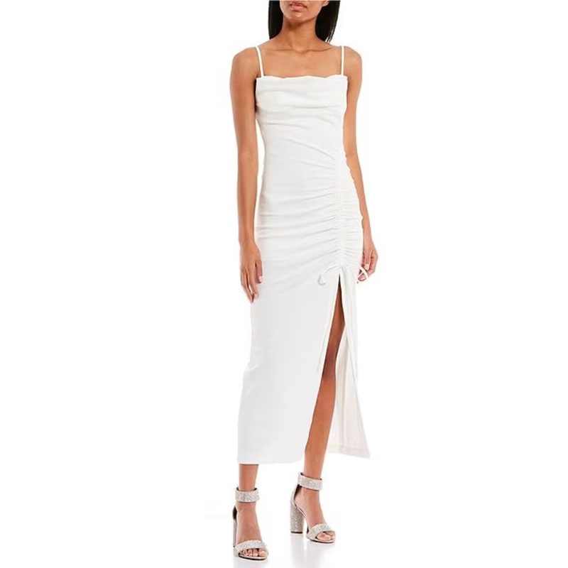 Pendant collar with parallel crease seam side slit drawstring medium length evening dress