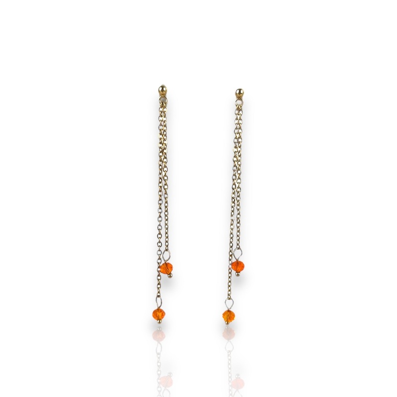 Pendientes cada en dorado con piedras color naranja al final.Estn hechos de acero quirrgico. Este material no pierde el color y no es alrgico.Material: acero alergnicoEste articulo esta diseado y fabricado integramente en Europa e importado por Sorellas