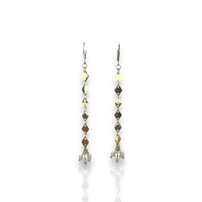 Pendientes con cada de rombos en dorado y perlitas al final.Estn hechos de acero quirrgico. Este material no pierde el color y no es alrgico.Material: acero alergnicoEste articulo esta diseado y fabricado integramente en Europa e importado por Sorellas