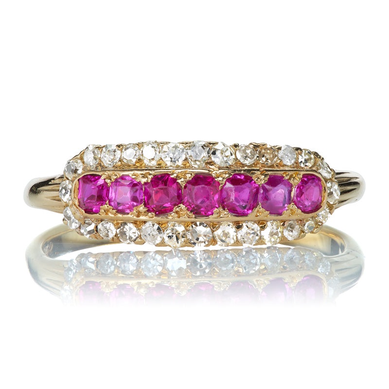 A fanciful, beautiful antique featuring luminous, raspberry-colored rubies and glowing diamonds. We love this sweet ring and its rows of eye-catching stones, ribbed shoulders, and finger-spanning shape. A happy, pretty vintage piece that makes us swoon!