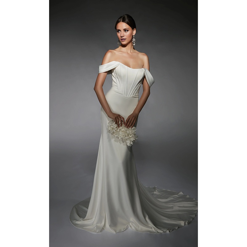 Perfect satin off shoulder slim fit trumpet shaped backless tight corset wedding dress
