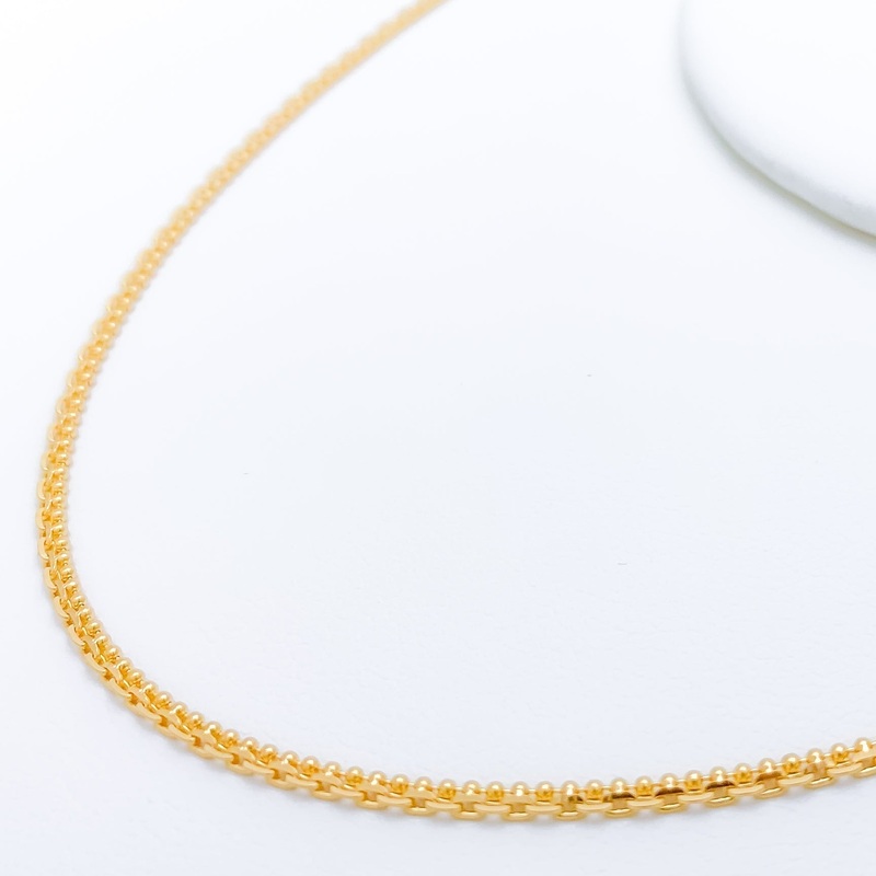 Expertly crafted in 22k yellow gold, this 20-inch chain weighs 6.1 grams and showcases a refined flat beaded design. With a slim 2mm width, it offers a subtle shimmer that enhances its graceful aesthetic. The polished finish provides a classic golden glow, while the secure lobster lock ensures dependable wear. Its lightweight elegance makes it a versatile accessoryideal for layering or making a soft statement on its own, effortlessly blending timeless beauty with everyday sophistication.
