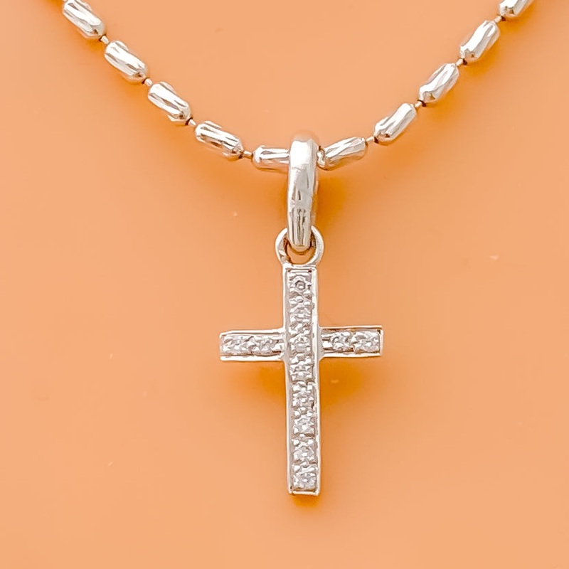 This 18k white gold cross pendant, weighing 1.0 gram, features a petite design adorned with 0.11 carats of diamonds. The diamonds, with an F-G color and VS clarity, add exceptional brilliance and elegance. Measuring 0.8 inches in length, this pendant is perfect for adding a touch of refined charm to any collection. Ideal for those who appreciate luxurious and sophisticated jewelry, its exquisite craftsmanship and timeless design make it a standout piece, perfect for enhancing your personal style.