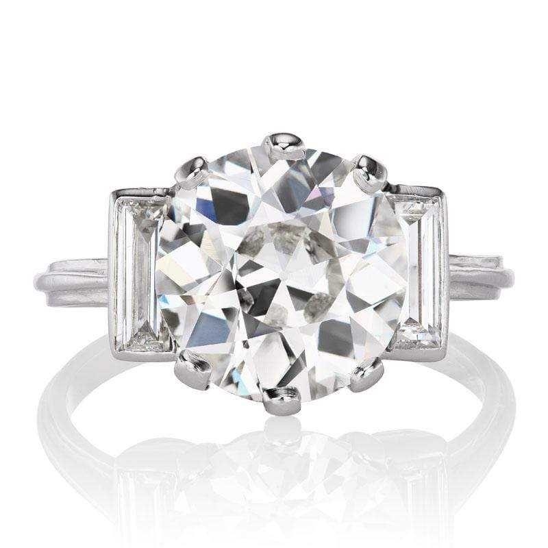 The Petra 3.25 ring isan AB original design made right here in NYC. The ring centers a GIA-certified 3.25-carat transitional cut diamond ofJ color,SI1 clarity. To each side of the center stone is a bezel-set vertical baguette combining for approximately 0.30 carats. The stones are set in a6 prong platinumsetting. The ring is currently size6 and can be resized!