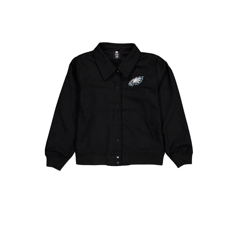 The Philadelphia Eagles Sport Night Women's Jacket features an embroidered Eagles logo at the left chest with a snap button closure and a twill applique team wordmark at the rear.Fabric: 90% Polyester, 10% Wool