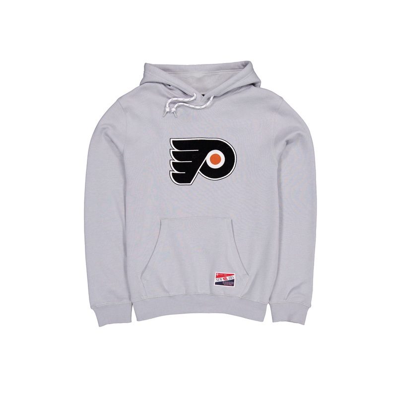 The Philadelphia Flyers Throwback Gray Hoodie features a corduroy applique Flyers logo and kangaroo pocket at the front.