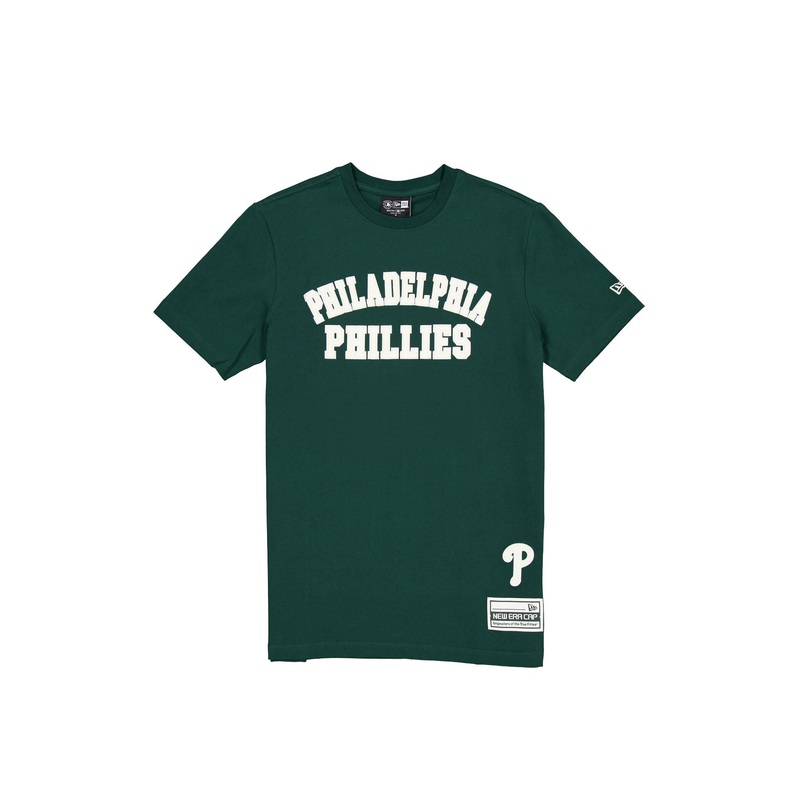 The Philadelphia Phillies Dark Green Logo Select T-Shirt features a zig zag stitched twill applique Phillies wordmark at the chest with an embroidered team logo above a woven tag at the left hip.