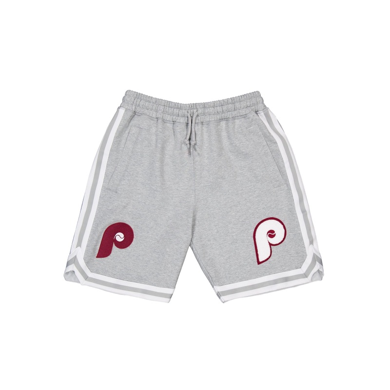 The Philadelphia Phillies Gray Logo Select Shorts features a chenille applique Phillies logo at the left leg with an alternate team logo patch embroidered at the right leg.