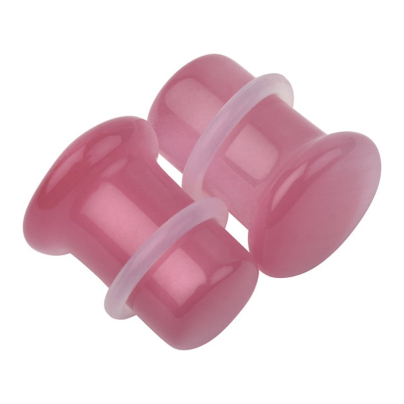 These single flare convex plugs are made from pink cat's eye glass. They have a wearable area of 3/8" and come with a pair of clear silicone o-rings. Choose your size below.[click here for replacement o-rings]