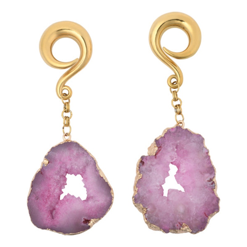 These 0 gauge pink geode slice weights are suspended from gold PVD coated 316L stainless steel coils. Each one is unique and will vary in size, color and dimensions. Choose your size below.