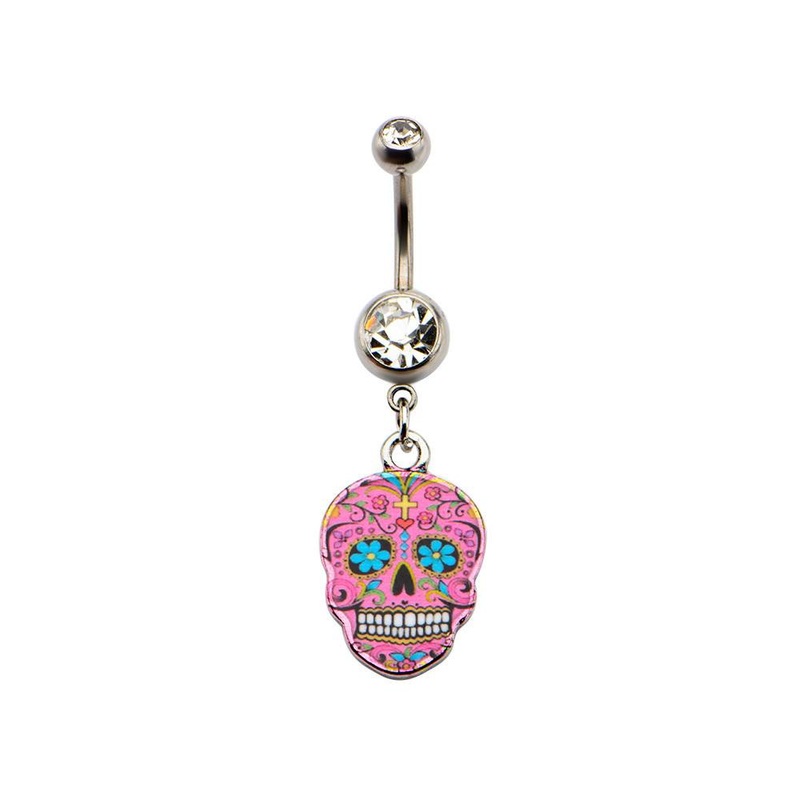 The 14 gauge pink sugar skull dangle belly barbell is made from externally threaded 316L stainless steel. Only the 5mm ball end is removable.