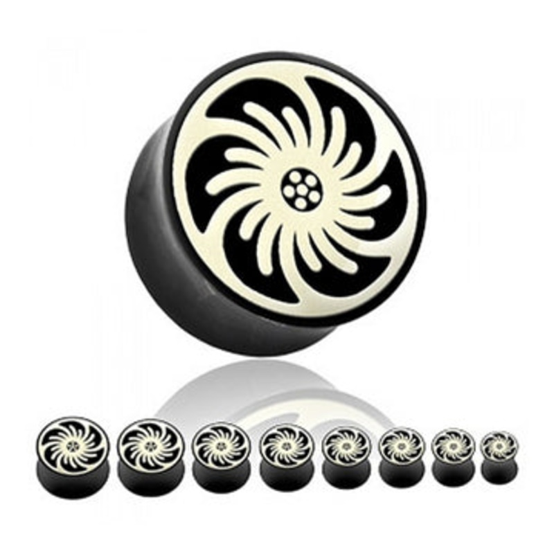 These double flarepinwheel plugs are made from handcarved water buffalo horn with crushedbone inlay. Choose your size below.