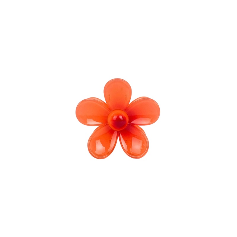 Pinza para el pelo en forma de flor de color naranjacon diseo rojoen el centro.