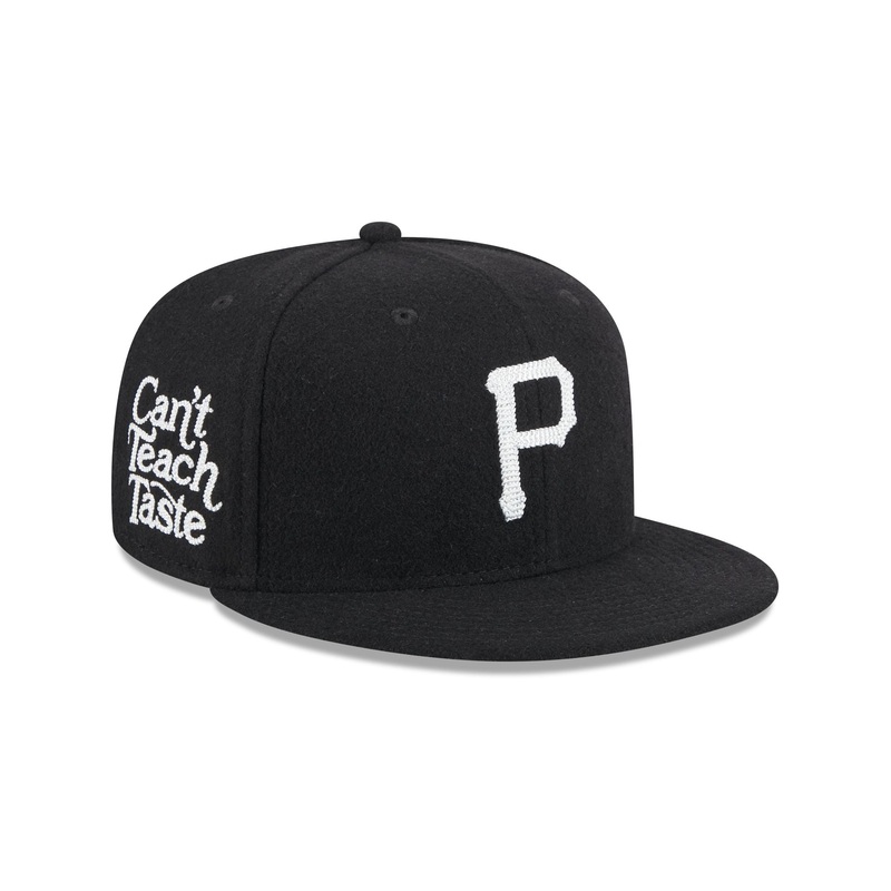 The Pittsburgh Pirates Diet Starts Monday Can't Teach Taste Black 59FIFTY Fitted Cap features an embroidered Pirates logo at the front with a matching MLB Batterman logo and Diet Starts Monday logo at the rear. Additional details include a Can't Teach Tast